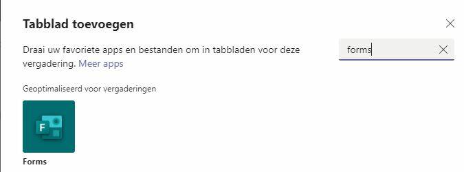Tijdens de vergadering klik je in de zwarte balk op het icoontje van Forms, daar kun je vragen openen, sluiten, resultaten bekijken en zelfs nog een vraag toevoegen: